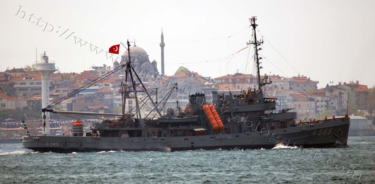 This is A-585 TCG AKIN. She is a swimming piece of history. She was build as a Chanticleer class submarine rescue ship, named ASR-10 USS Greenlet. She was launched in 1942 and commissioned in USN in 1943.