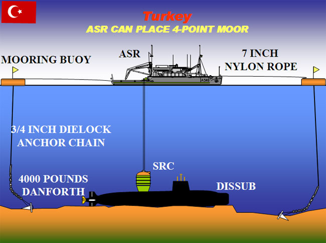 In a case of Subsunk, she would spend many valuable hours on the way. Her ability to help the crew escape from distressed sub is limited as well. The only way TCG Akın can reach a distressed sub is, by the Submarine Rescue Chamber, a modified McCann Bell she caries. These deficiencies were address two fold. First Turkey became a member of the International Submarine Escape and Rescue Liaison Office (ISMERLO).