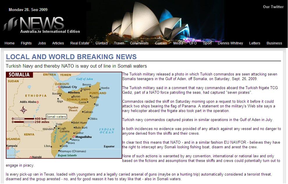 According to http://www.australia.to website Turkish Navy is is way out of line in Somali waters when naval special forces were seen attacking seven Somali teenagers in the Gulf of Aden, off Somalia.