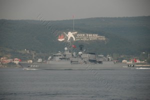 TCG Turgutreis, one of the frigates of the Turkish Naval Task Force, seen here in Dardanelles, in April.