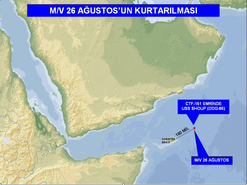 The incident was immediately forwarded to the CTF-151, commanded by a Turkish Admiral and the nearest CTF-151 warship to M/V 26 Ağustos, USS Shoup was dispatched to the attacked ship.