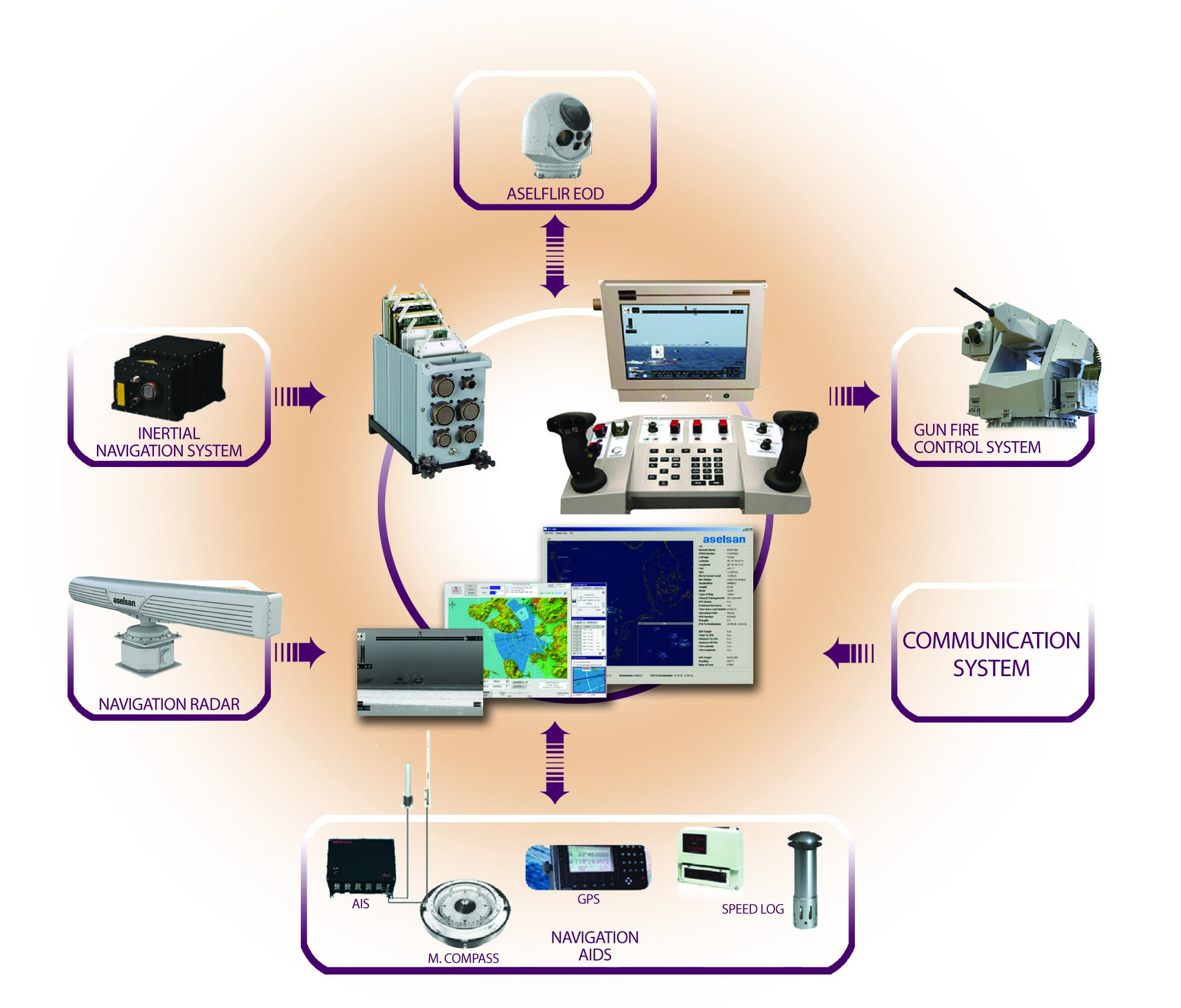 The Combat, combat management systems consists of the hardware and software necessary for the process, visualization, control and share of the data coming from the sensors. The Combat CMS will create a tactical picture of the maritime domain around the merchant convoy and share this information through a network with the Kangal boats. The boats will also have Combat CMS installed so that they can have access to the global maritime picture and control their weapons effectively.