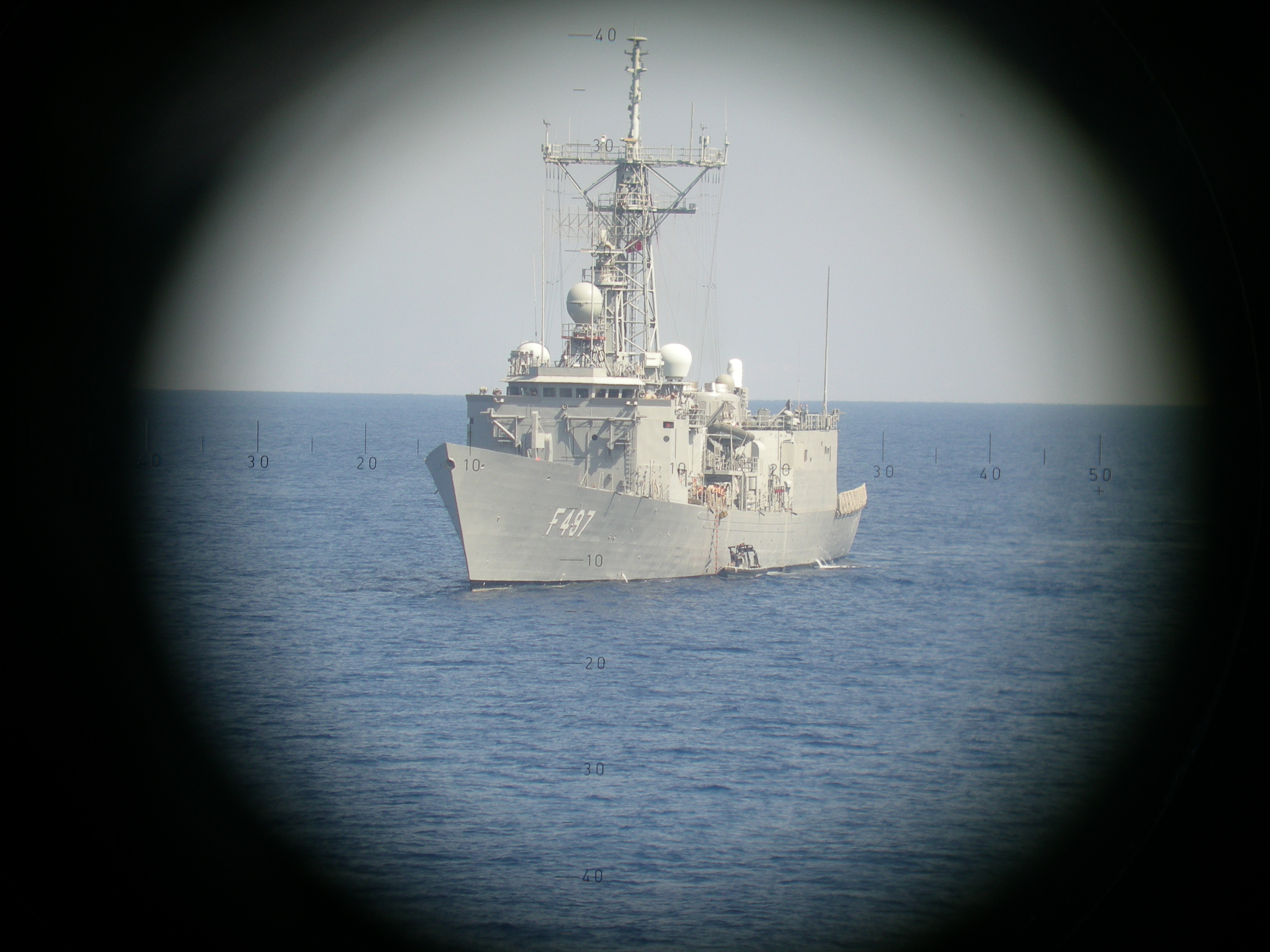 The above is a photo from the official web page of Greek Naval Forces. Please mind that the photo is only in the Greek part of the web site and cannot be found on the English part. The photo shows the Turkish frigate F-497 TCG Göksu, taken from the periscope of a Greek submarine. The original photo can be found at the “Shots” section of the Photo Gallery of Greek Navy.