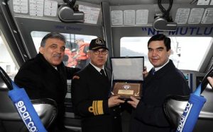 His host, Turkish President Abdullah Gül, took him for a ride on board of the Turkish Coast Guard vessel TCSG-303, after attending the Turkish-Turkmen Business Forum. The forum organized by the Foreign Economic Relations Board of Turkey (DEIK) and the Union of Chambers and Commodity Exchanges of Turkey (TOBB) took place in Çırağan Palace at Bosphorus.