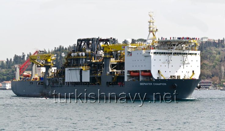 Shortly, after the previously mentioned warships, a giant ship made her southbound passage through Bosphorus. The drillship Deepwater Champion was since March 2011 in Black Sea searching for hydrocarbons in Turkish territorial waters and in EEZ. Her deployment in the Black Sea was financed by ExxonMobil and Turkish Petroleum Company, TPAO.