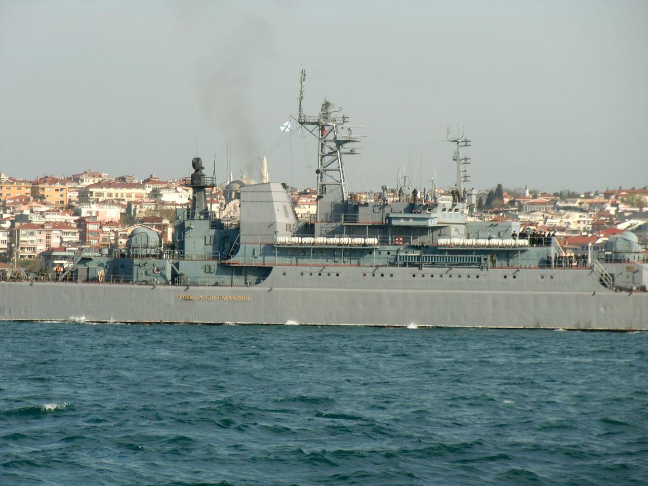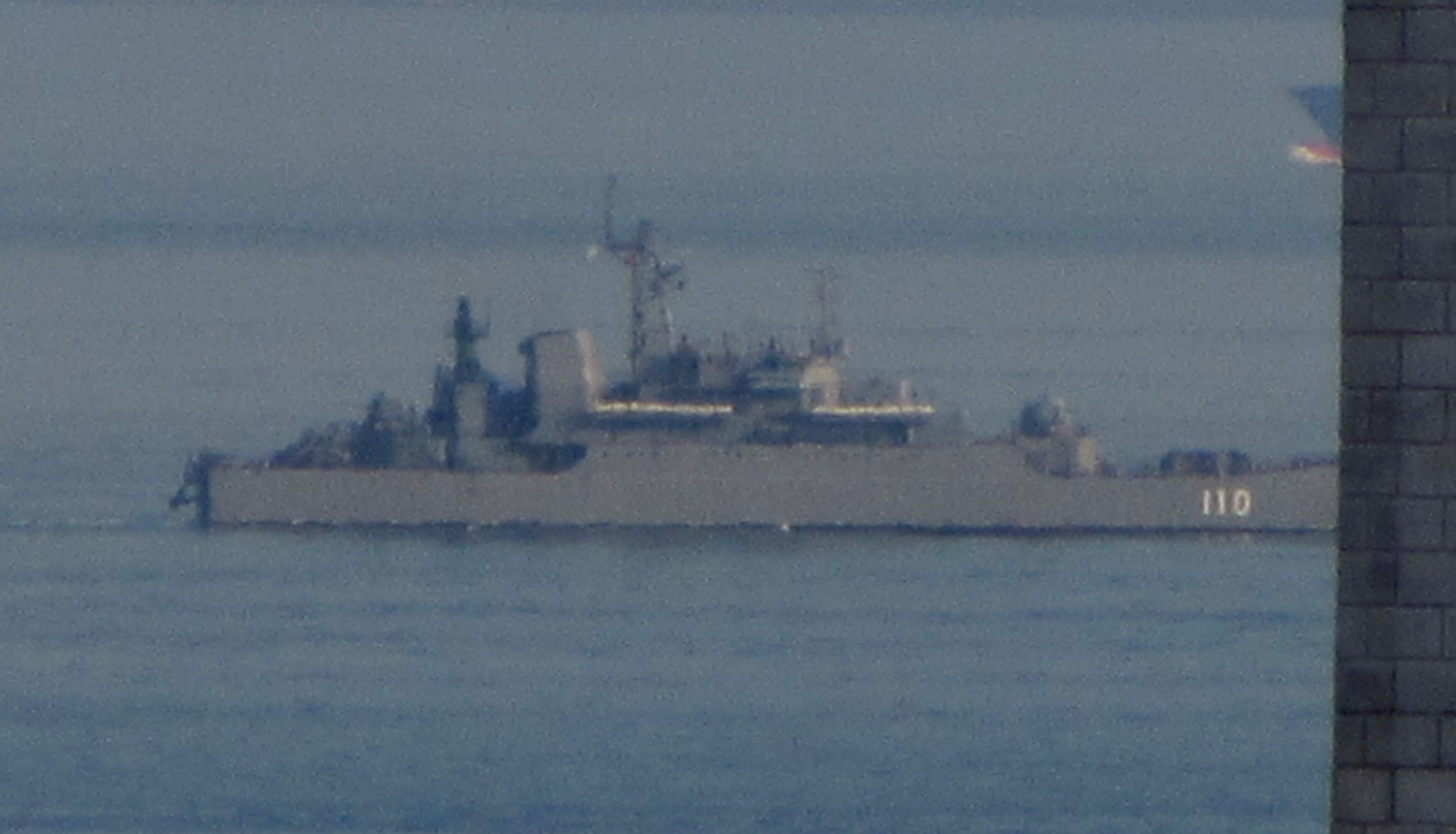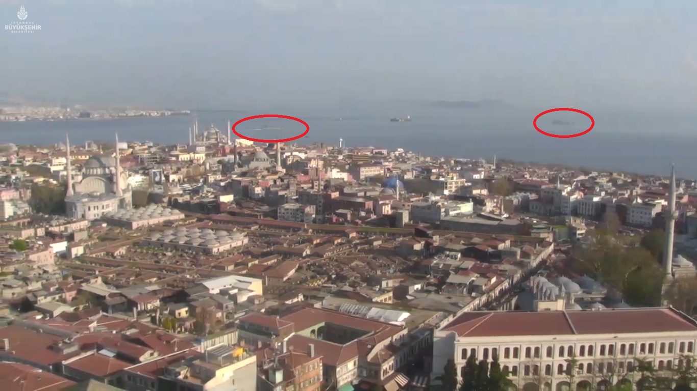 As the source is from a public webcam, the image quality is not very good but there are actually two Russian warships in it. I have marked them with red circles.
