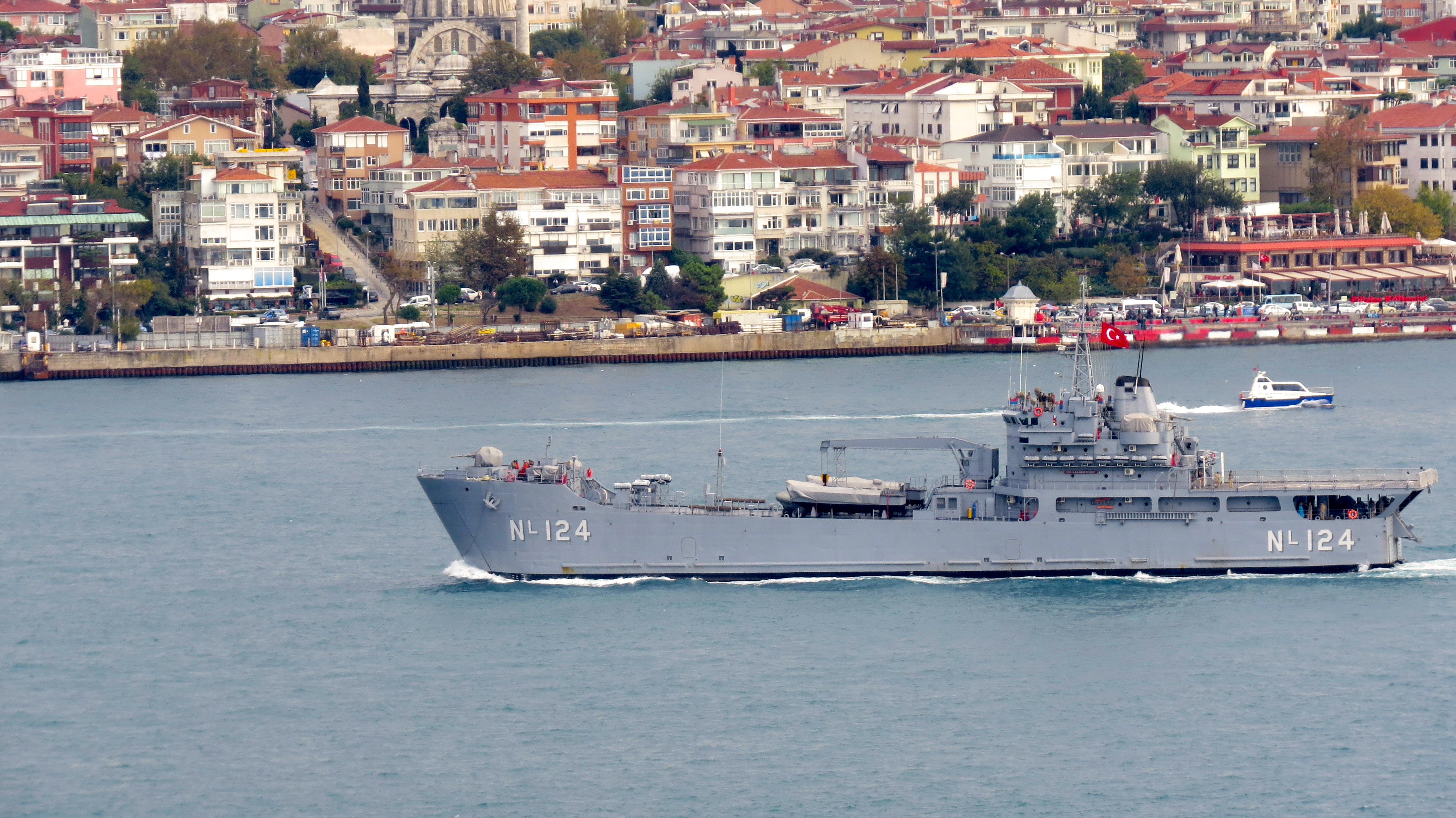 Turkish Sarucabey class landing ship NL-124 TCG Karamürselbey passing southbound, through Bosphorus on 29 September 2013. Photo: Deniz Yaman. Used with permission.