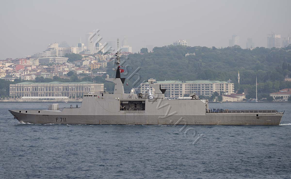 The French La Fayette class frigate F-711 Surcouf making southbound passage through Bosphorus on 17 June 2014.