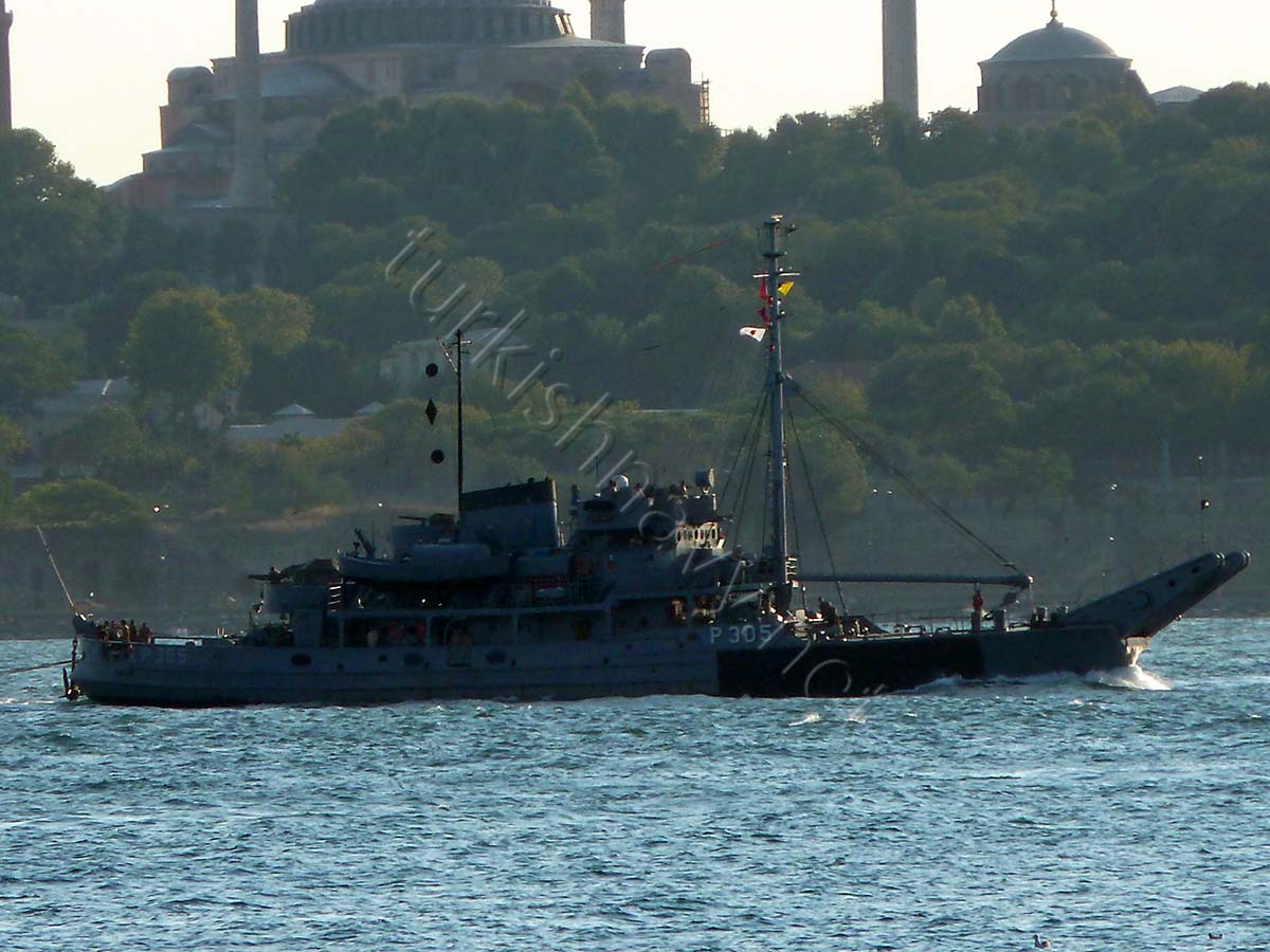 I have witnessed the northbound passage of the veteran boom defence ship TCG Ağ-5 through Bosphorus. In the age of long ranged ammunition the boom defence vessels are more or less useless for their original purpose. Thus TCG Ağ-5 is mainly used as a tug or buoy tender.