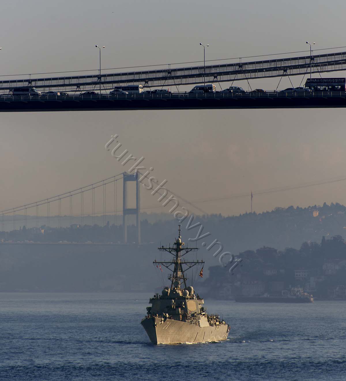 USS Ross passing under the Bosphorus Bridge connection Europe to Asia.