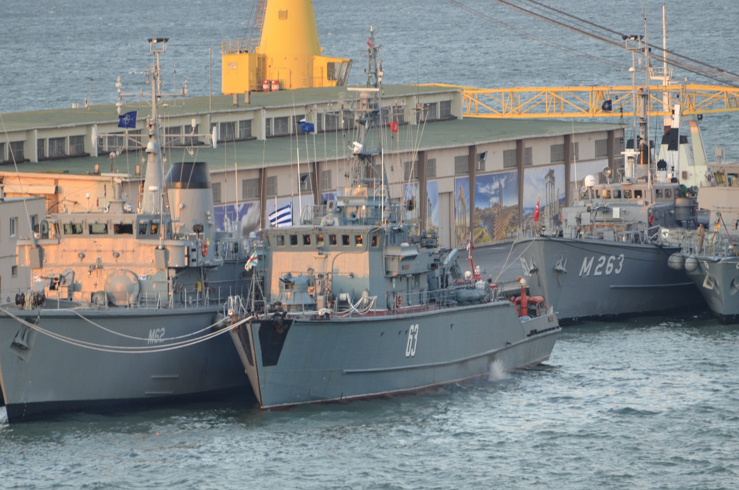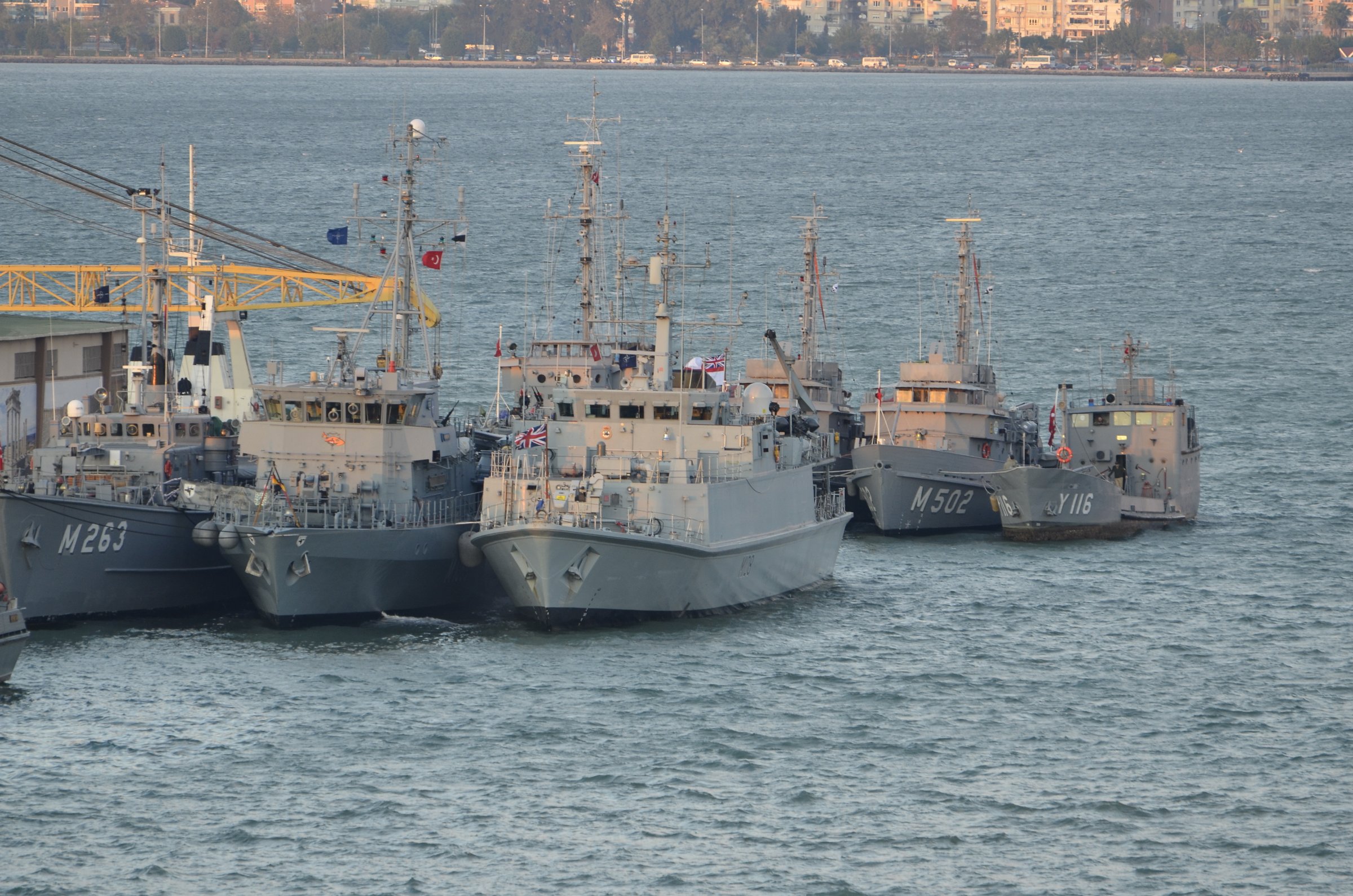 First row from left to right: M-263 TCG Erdek, M-1069 FGS Homburg, M-108 HMS Grimsby. Second row from left to right: M-503 TCG Finike, M-502 TCG Fatsa, Y-116 TCG Pınar 3. Photo: Oktay Cömert. Used with permission.