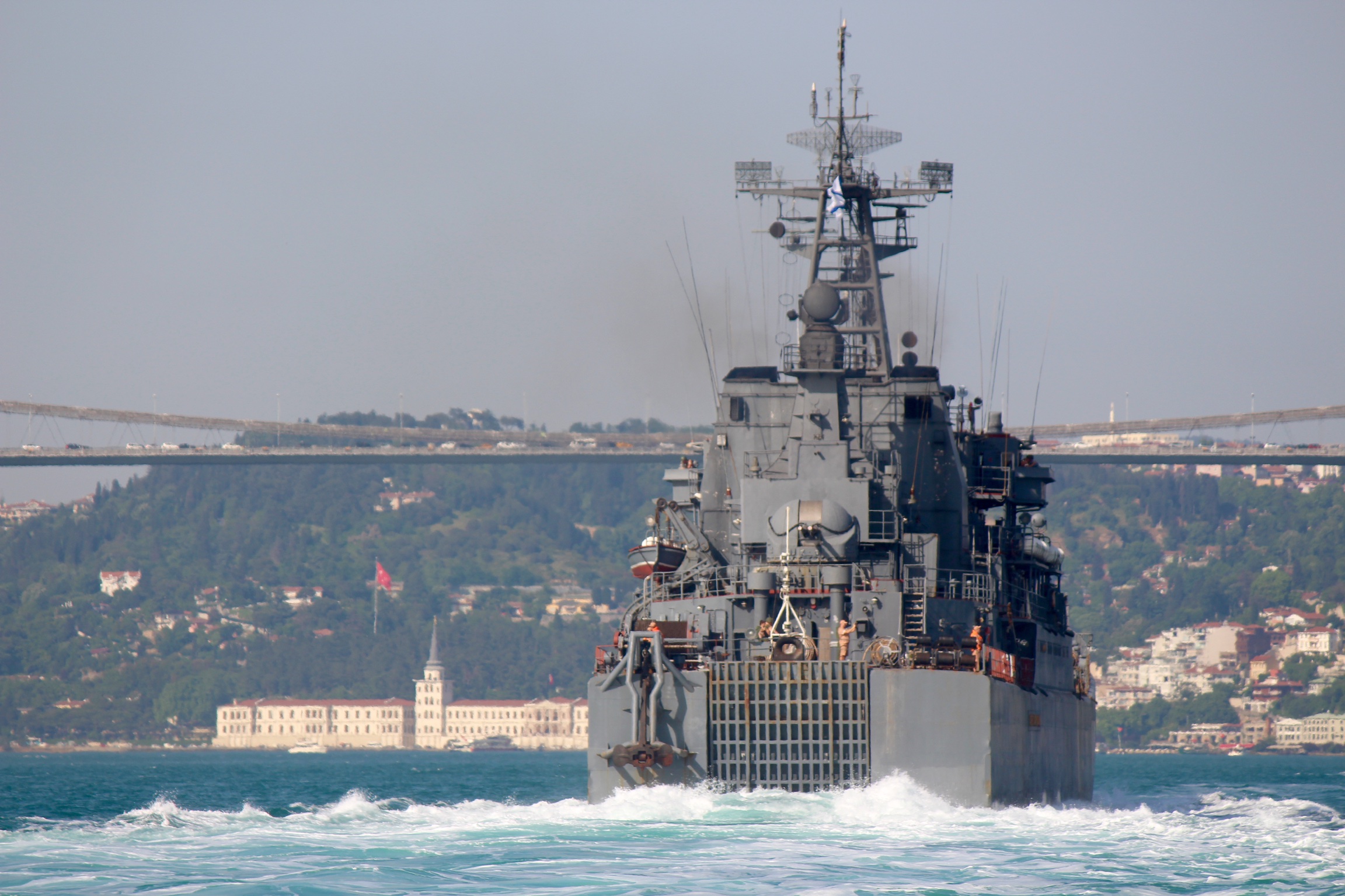 Russian landing ship Alexander Otrakovski, as it sails towards The Black Sea. Photo: Yörük Işık. Used with permission.