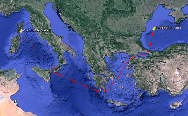 So here we have either a real flying Frenchman (her high-speed must have made her observance from the shores impossible as she passed through the Turkish Straits) or the AIS transponder is not correctly configured. Her real whereabouts is still a mystery to me.