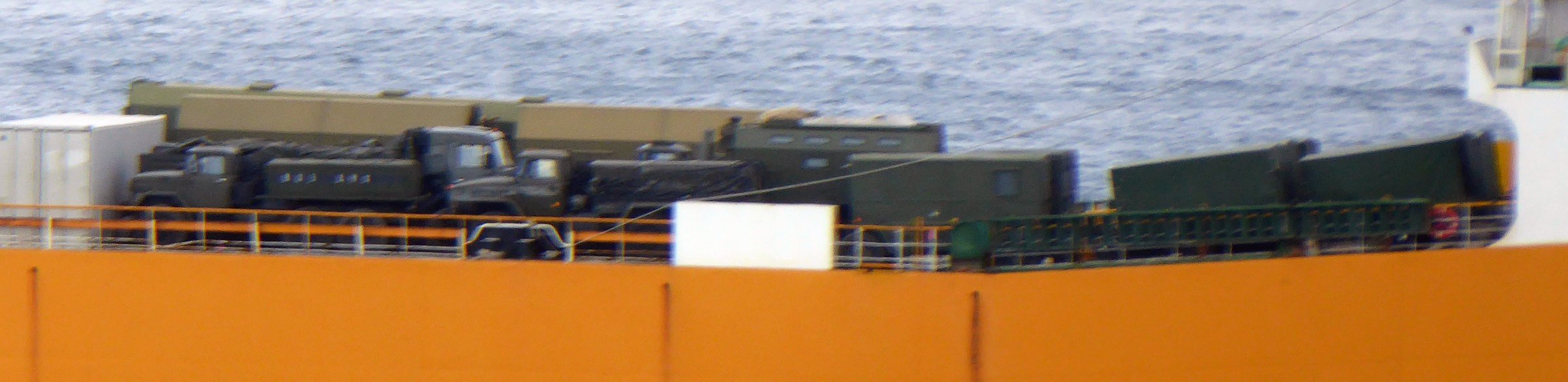 Her latest cargo has at least 20 ISO containers of which 3 are 40 feet and the rest are 20 feet. 4 trucks and 10 trailers are also visible on the deck.