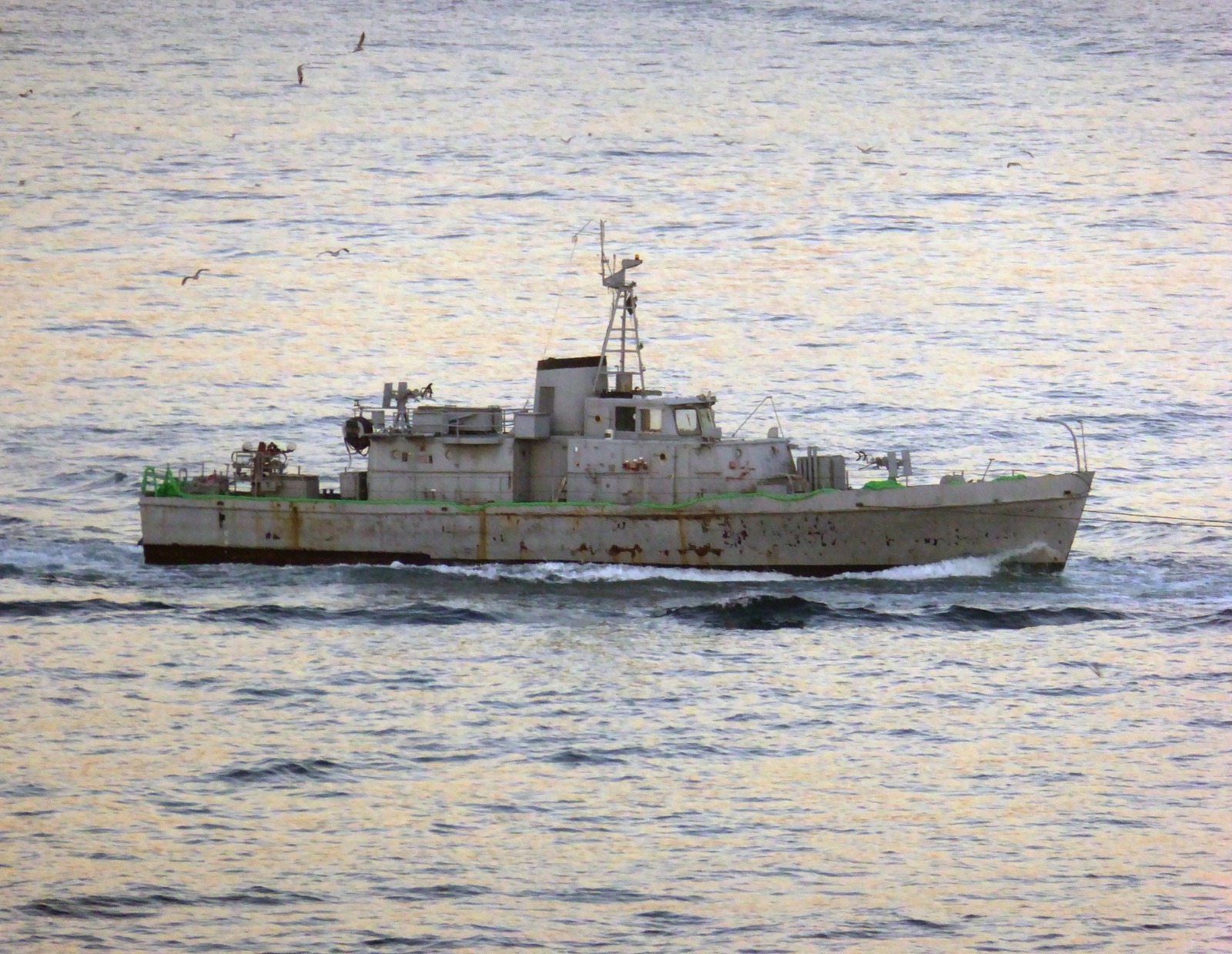 A commercial tug was towing this old hull of a former Turkish patrol boat to the Black Sea. As far as I know there are no ship breakers in Black Sea, this means she is about to get sunk.