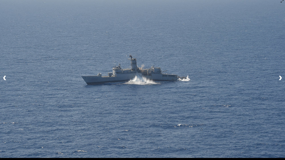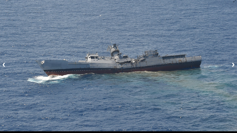 These are official Turkish Navy photos taken from a helicopter during the sinking of ex- TCG Zafer. The shape of the hull is not much different compared to the photo taken in Çanakkale. This indicates that she was not hit by any other weapons or missiles. This photo shows the initial explosion of a torpedo warhead under the keel of the ship. The force of the explosion lifts the ship up.