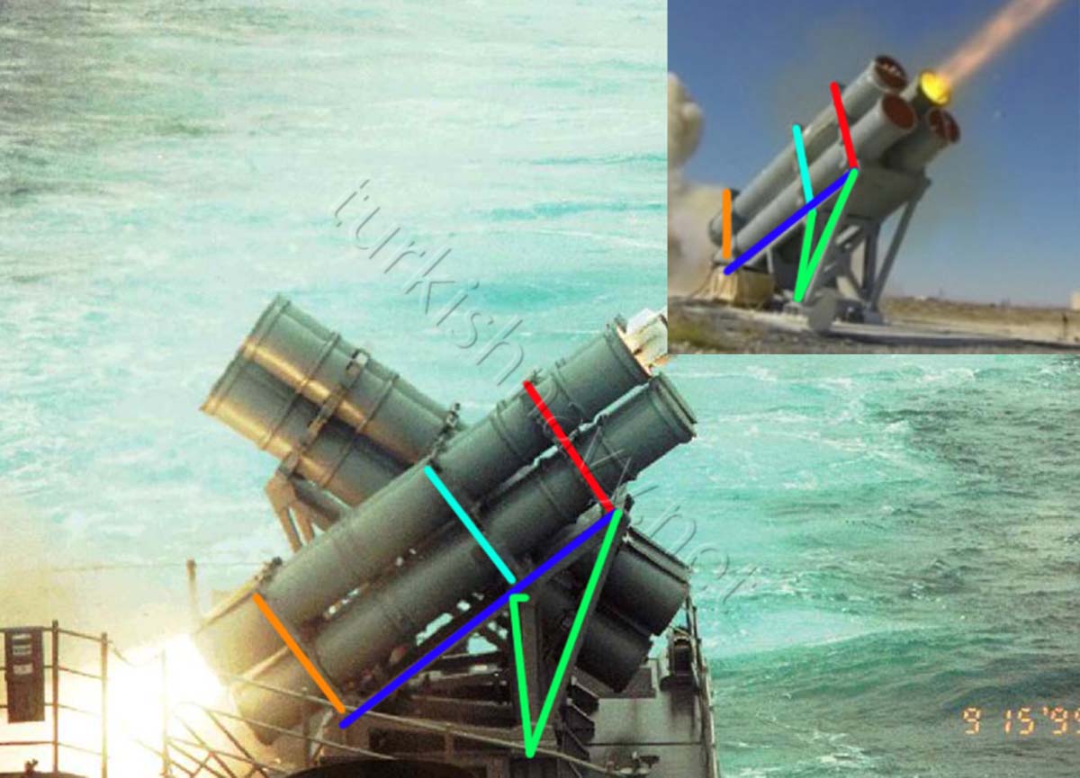 The launcher mount and the 4 canisters mounted on have very strong resemblance to an Mk-141 Harpoon missile launcher. I have put a standard Mk-141 launcher and the Atmaca launcher of the same photo and marked some features. The similarities are just too much, to be just a coincidence. Thus I believe that Atmaca was fired from a Mk-141 Harpoon canister. And for the rest of the text I will base my assumptions on this fact.