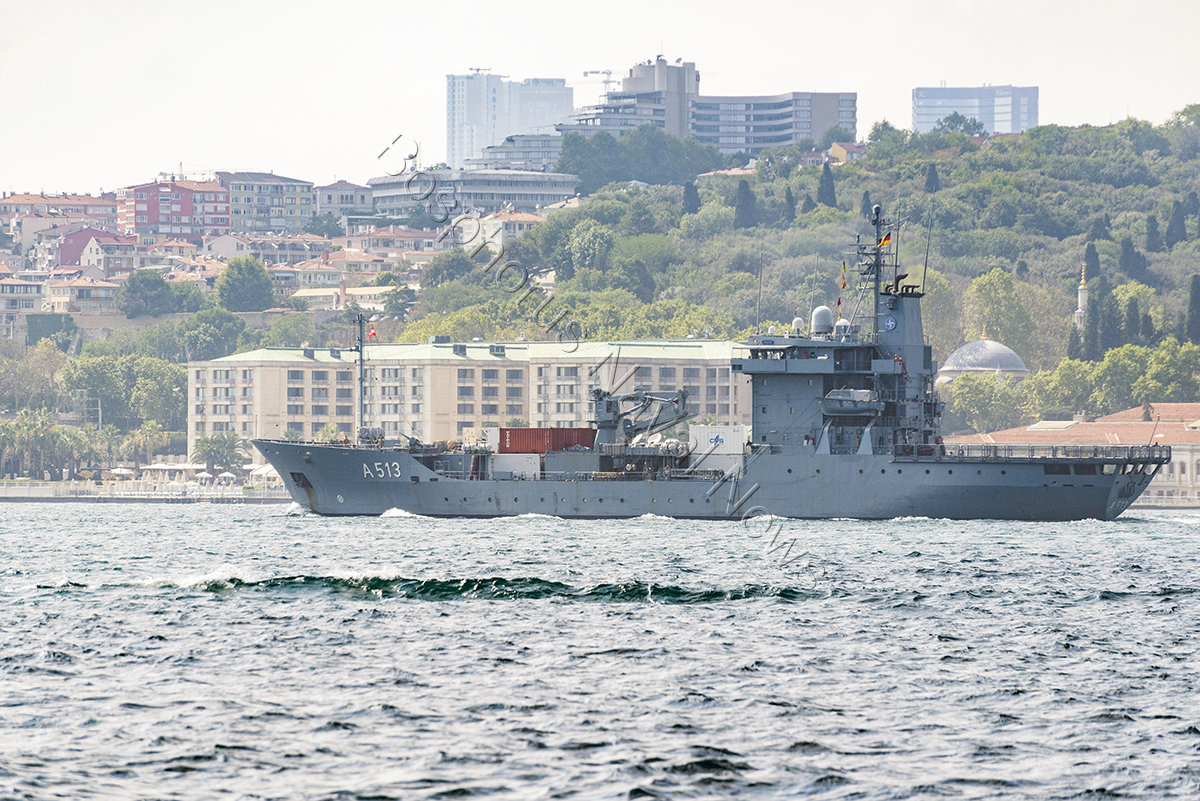 The flagship of Standing NATO Mine Countermeasures Group Two FGR Rhein, during her southbound transit through Istyanbul.