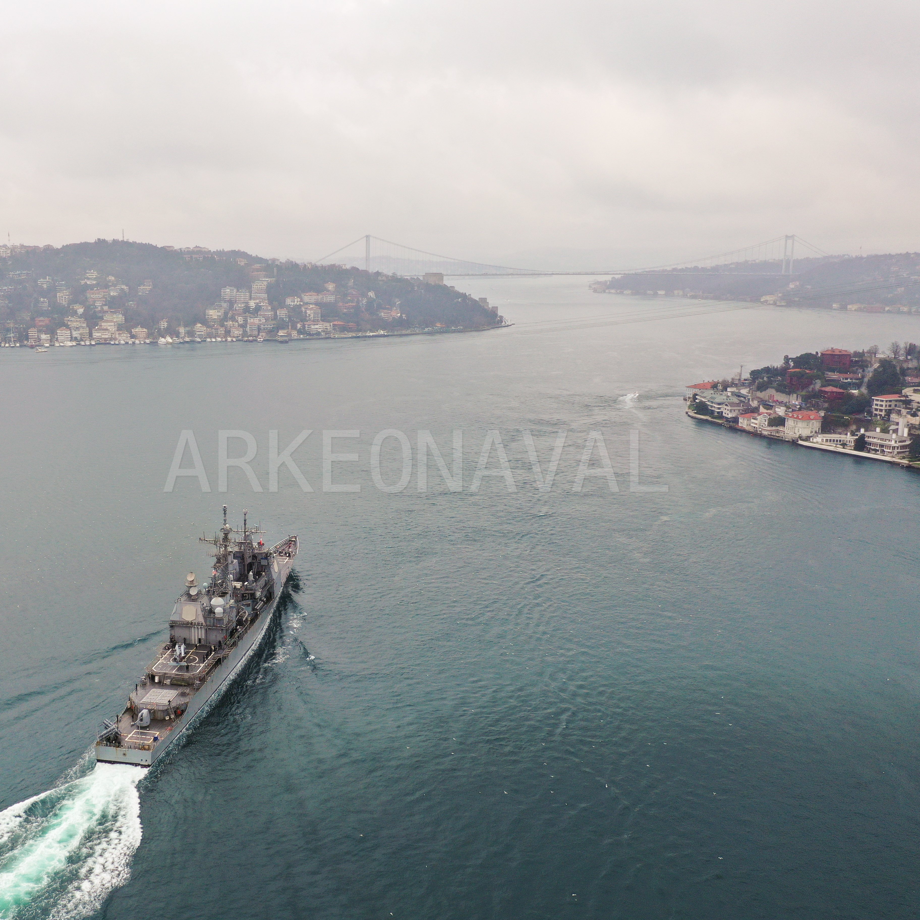 The outgoing flagship of NATO taskforce SNMG-2, ESPS Cristóbal Colón passed northbound through Istanbul. Photo: Arkeonaval
